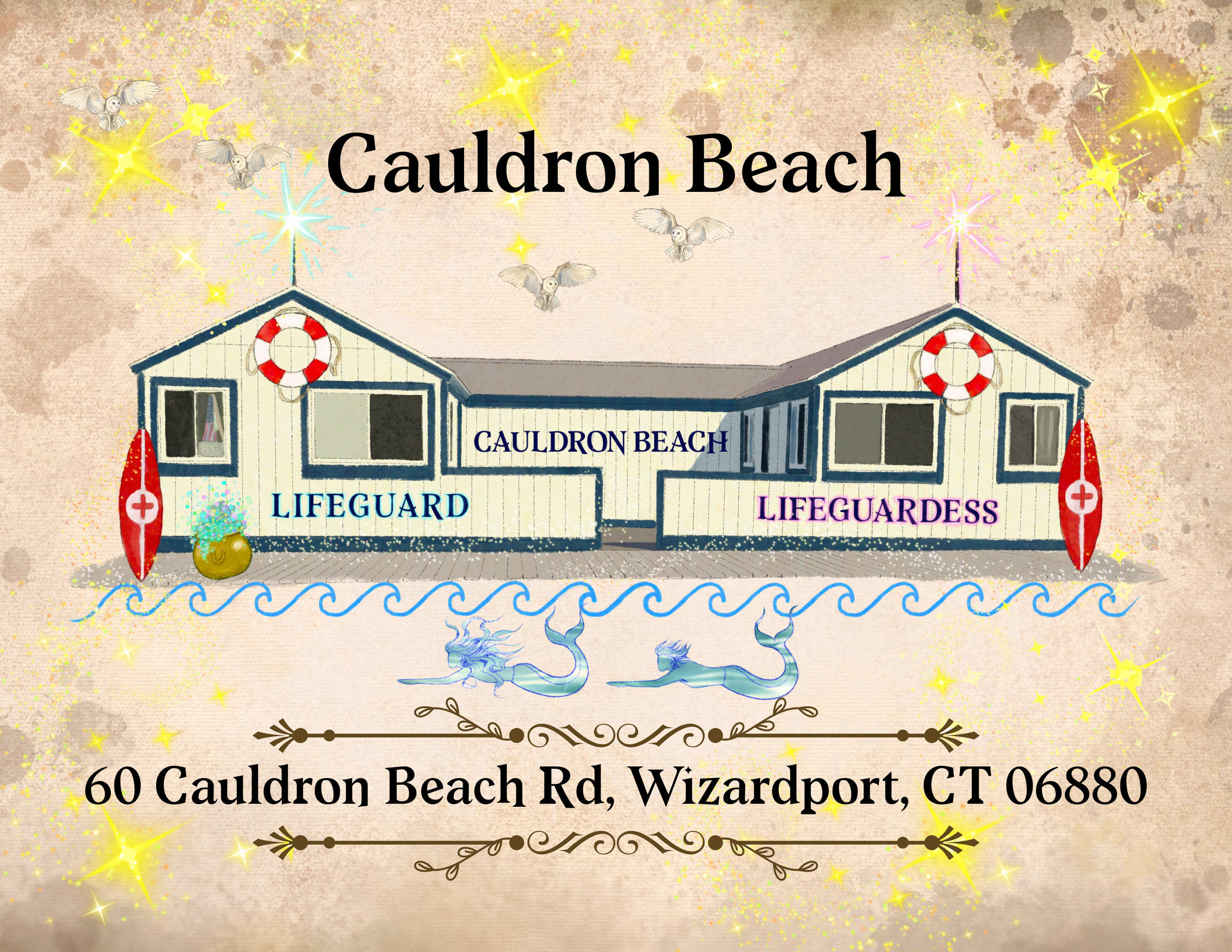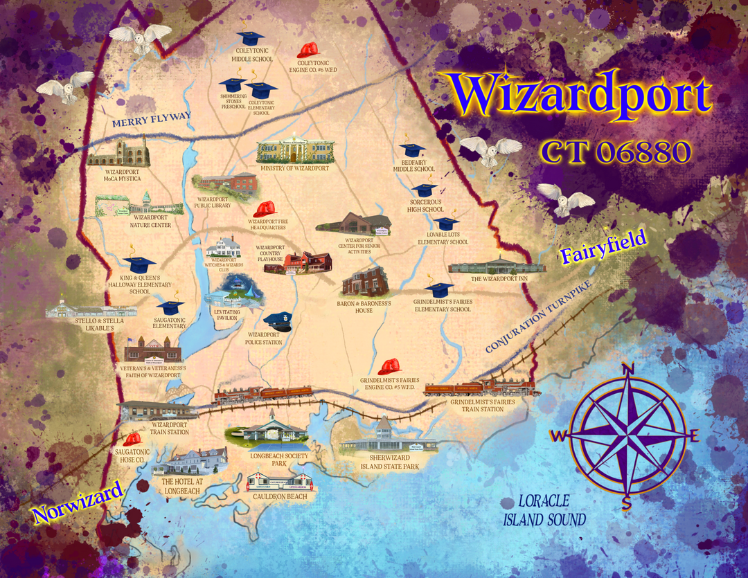 This fully illustrated magical guidebook reimagines the town’s most beloved places with hand-drawn art and playful write-ups—made even more enchanting with a touch of AI-powered magic in the text. From the Ministry of Wizardport (Town Hall) to Cauldron Beach (Compo Beach), enchanted schools, train stations, and even the Senior Center, every landmark hides a spellbinding secret.
