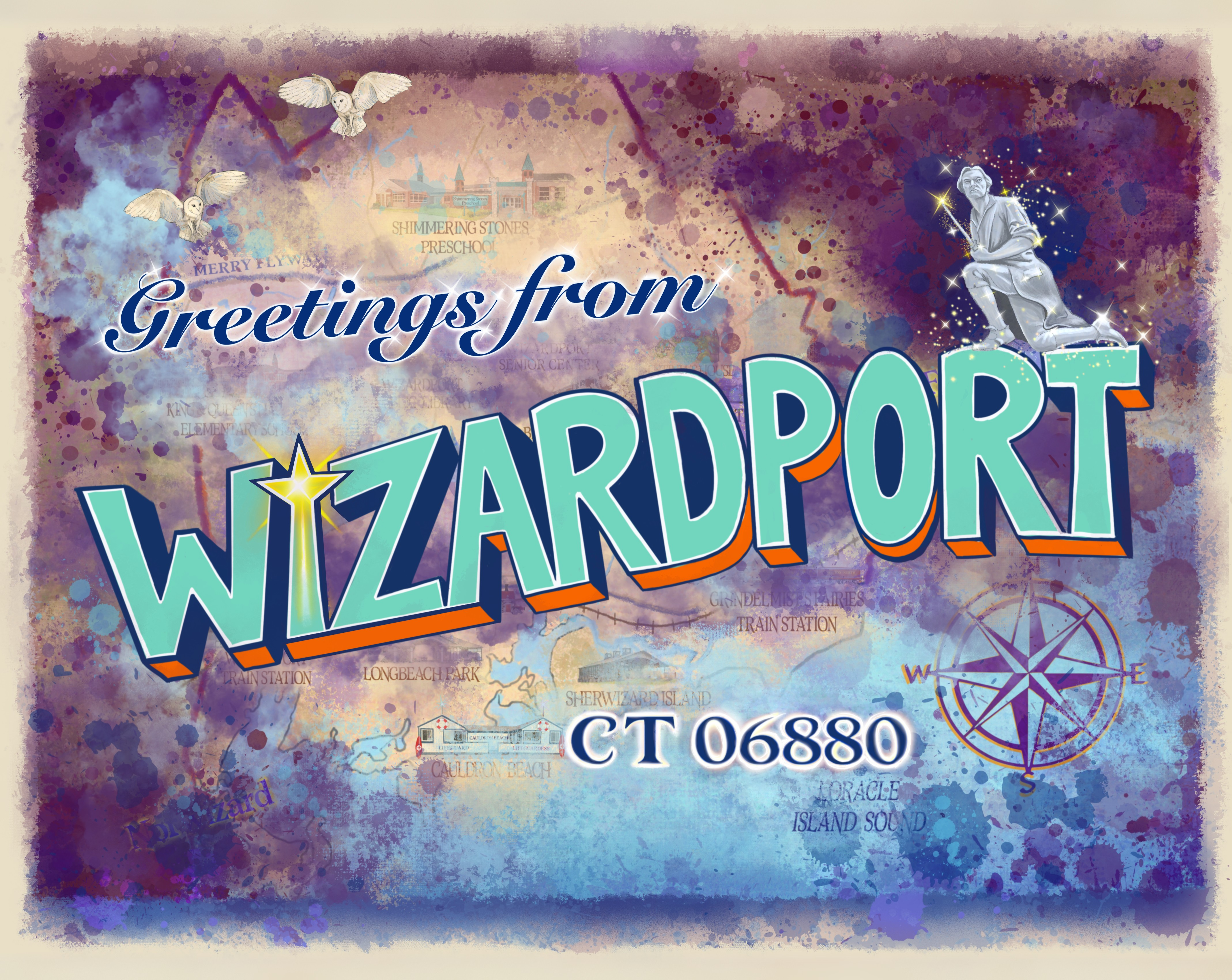 Design: Hand-illustrated “Greetings from Wizardport, CT 06880” artwork in vibrant, postcard-style lettering