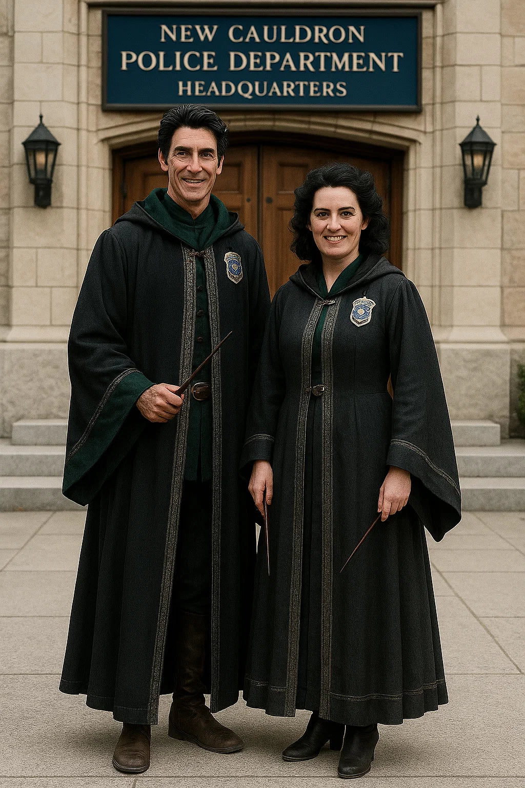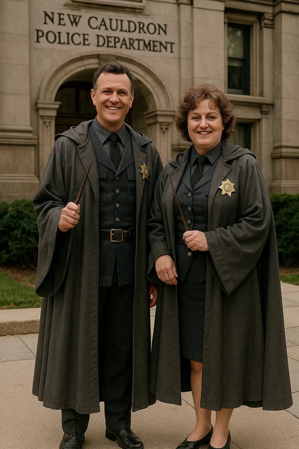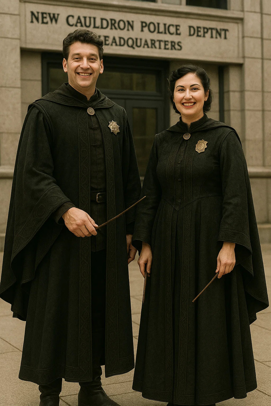 the policeman and policewoman couple #1 / the 35-year-old good human-witch and good human-wizard couple of The Likable Law-Enforcers / the 35-year-old good human-witch and good human-wizard couple.