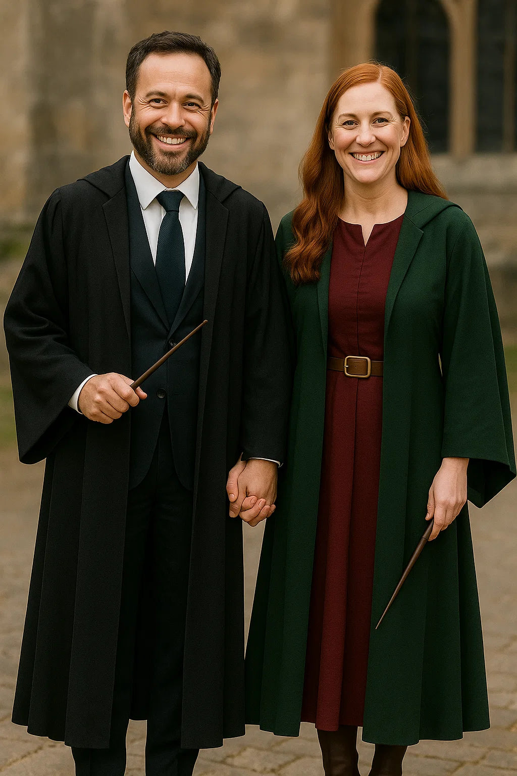 the American actor and actress couple / the 35-year-old good human-witch and good human-wizard couple.