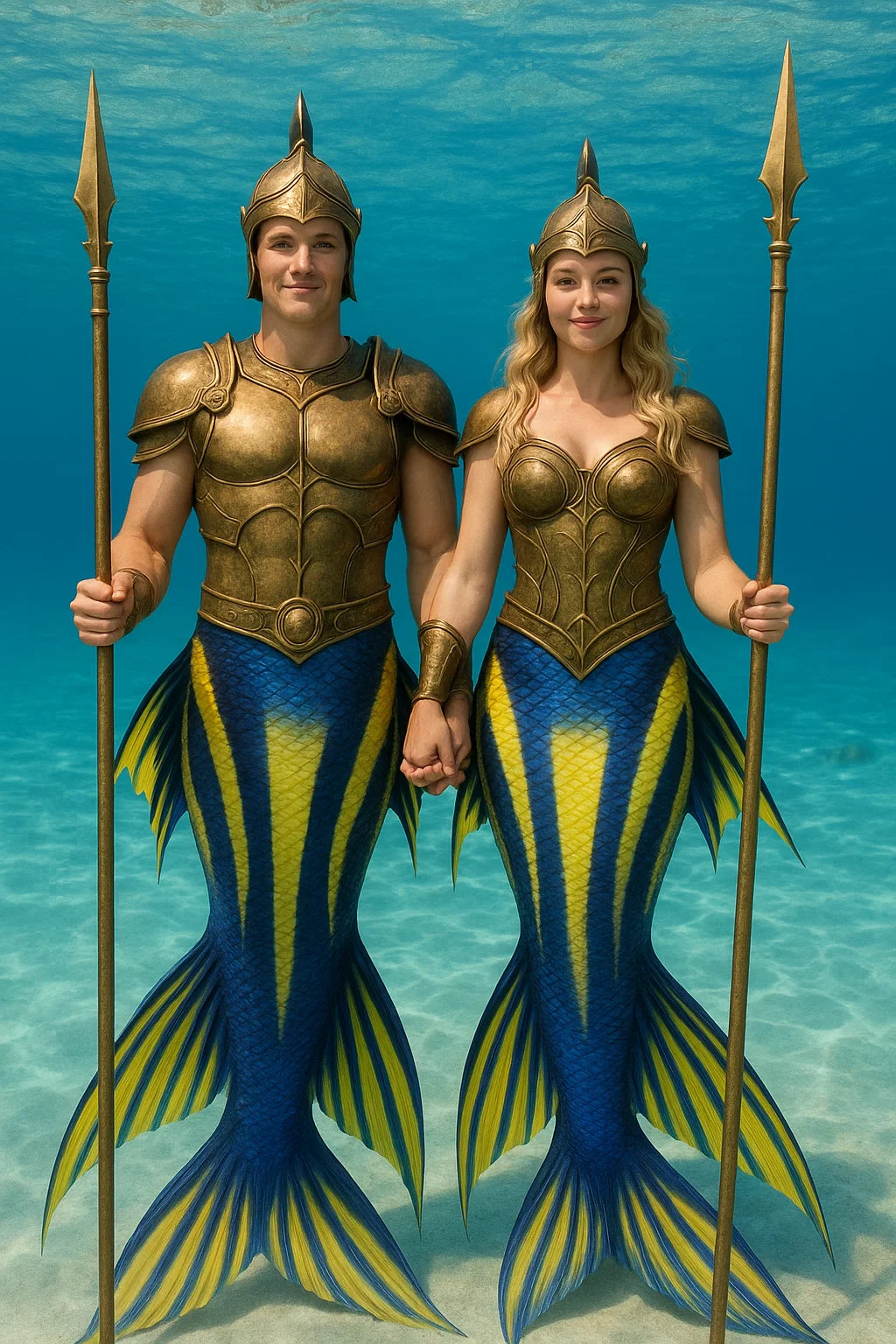 the guard and guardess couple #2 of Aquanara / the 35-year-old merman and mermaid couple.