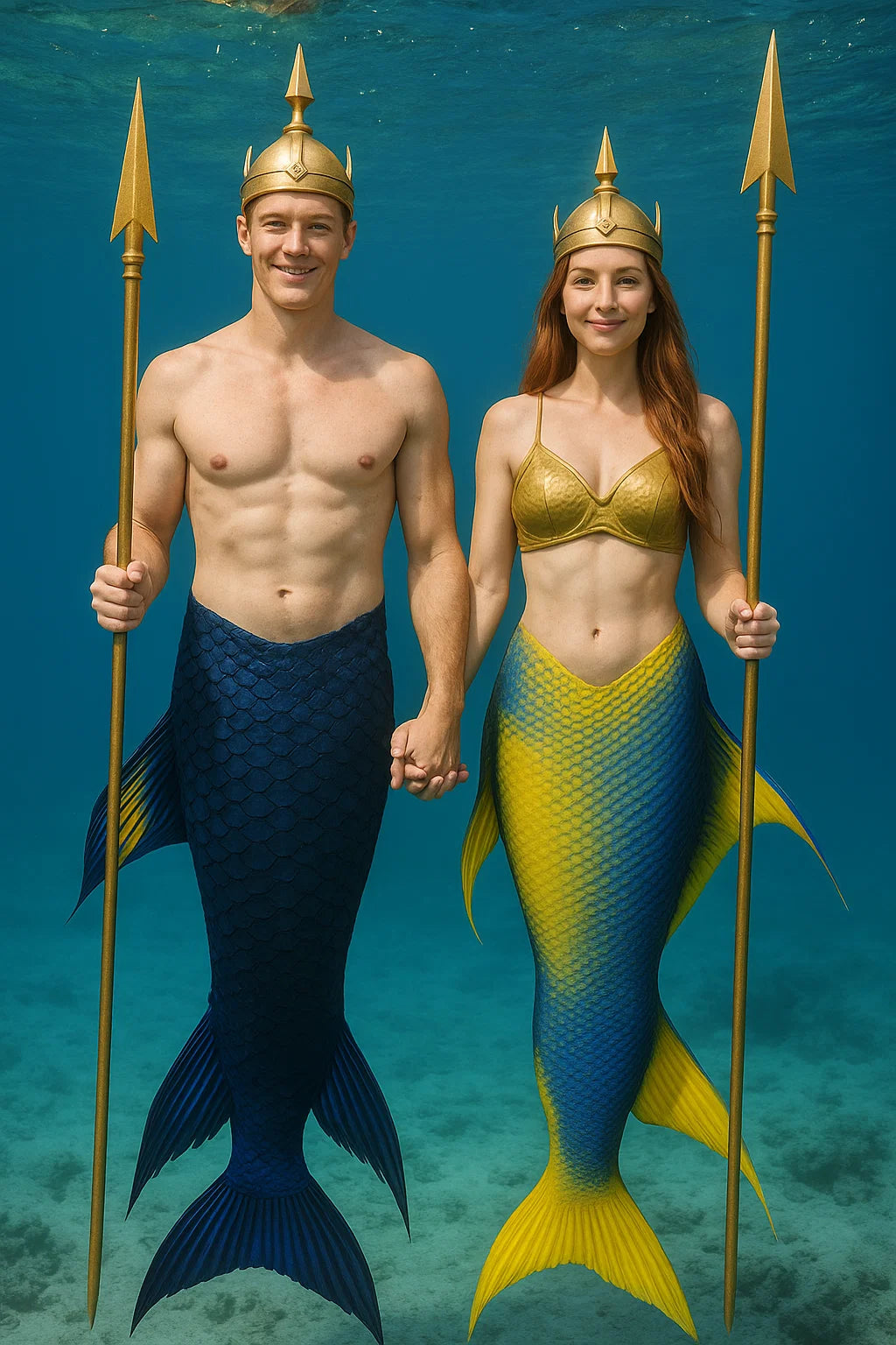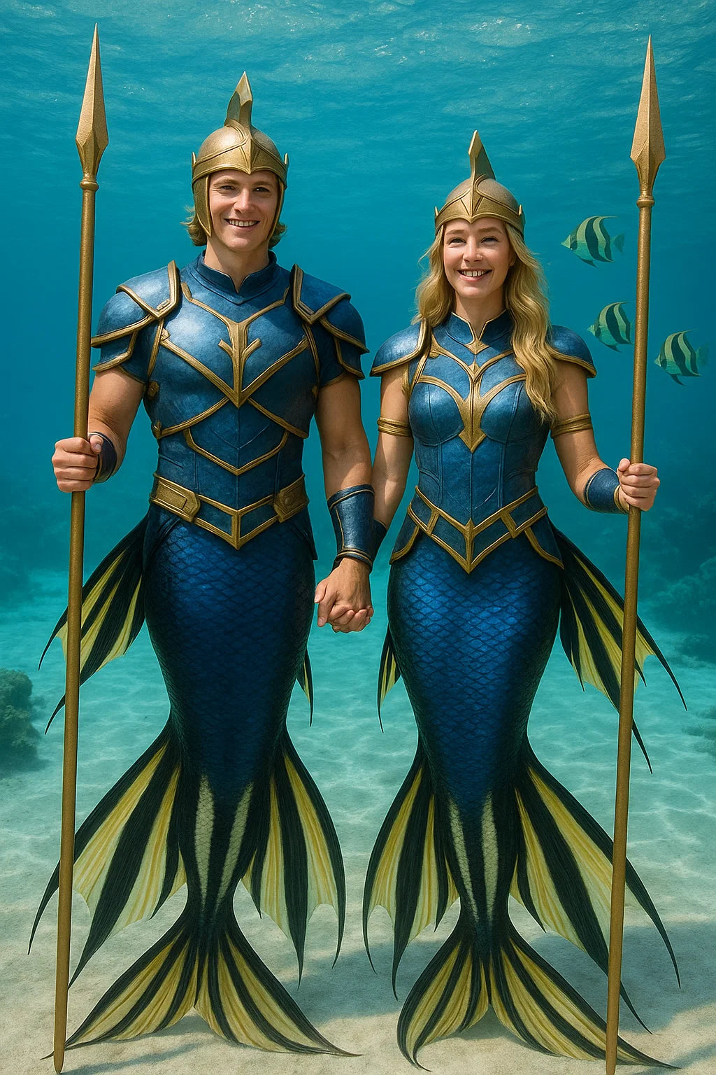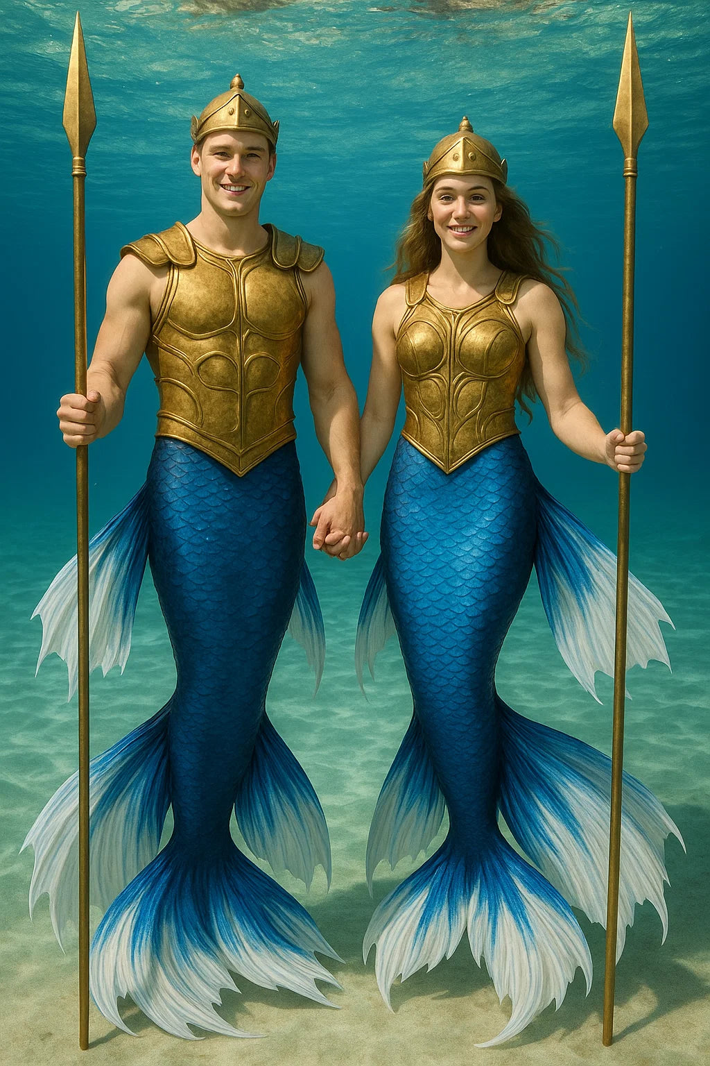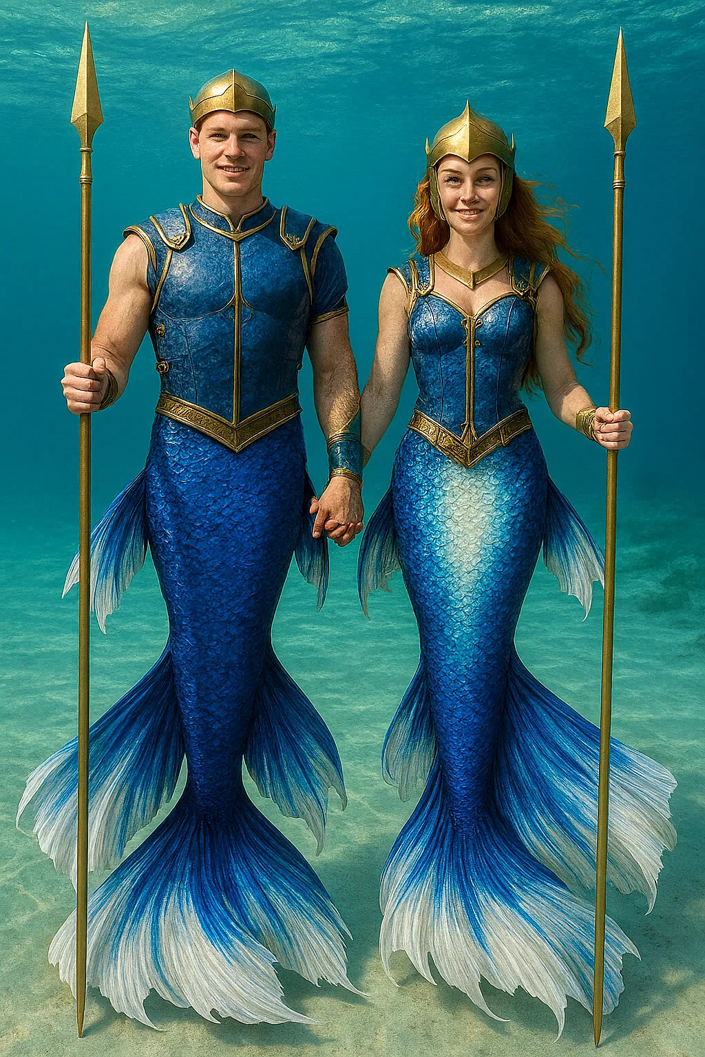 the guard and guardess couple #1 of Aquanara / the 35-year-old merman and mermaid couple.