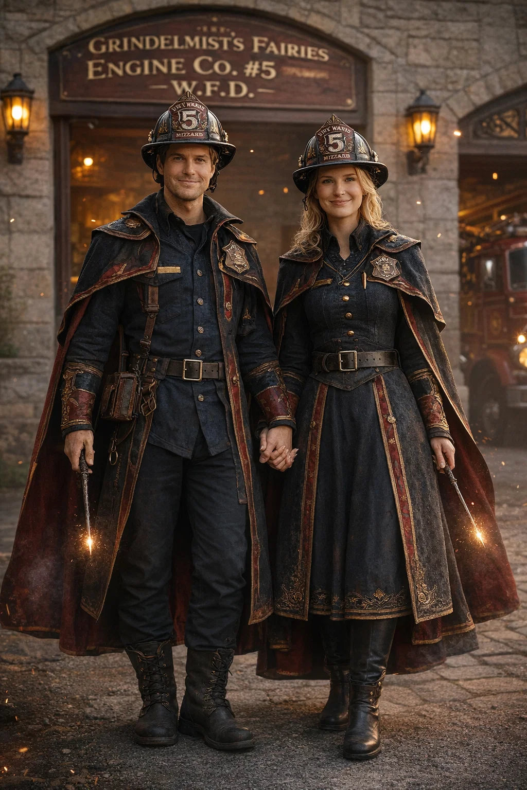 the fireman and firewoman couple #5 of Wizardport Fire Headquarters / the 35-year-old good human-witch and good human-wizard couple.