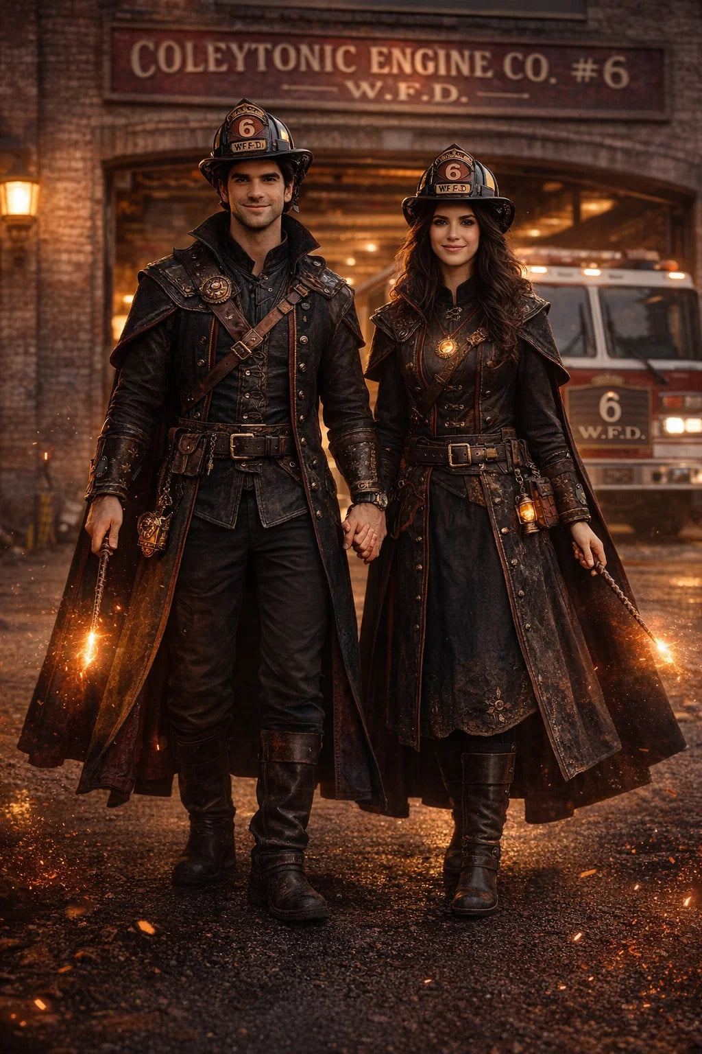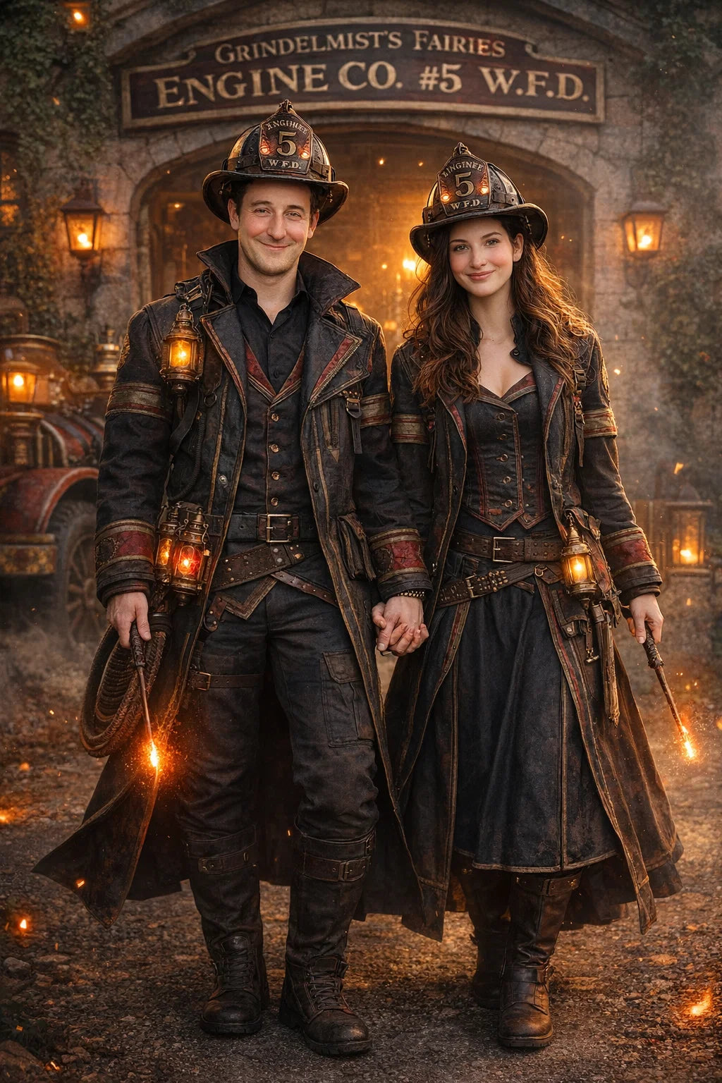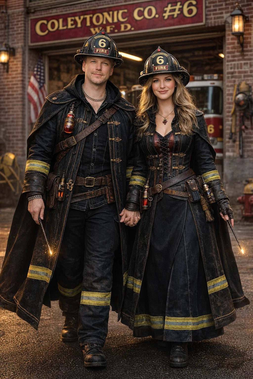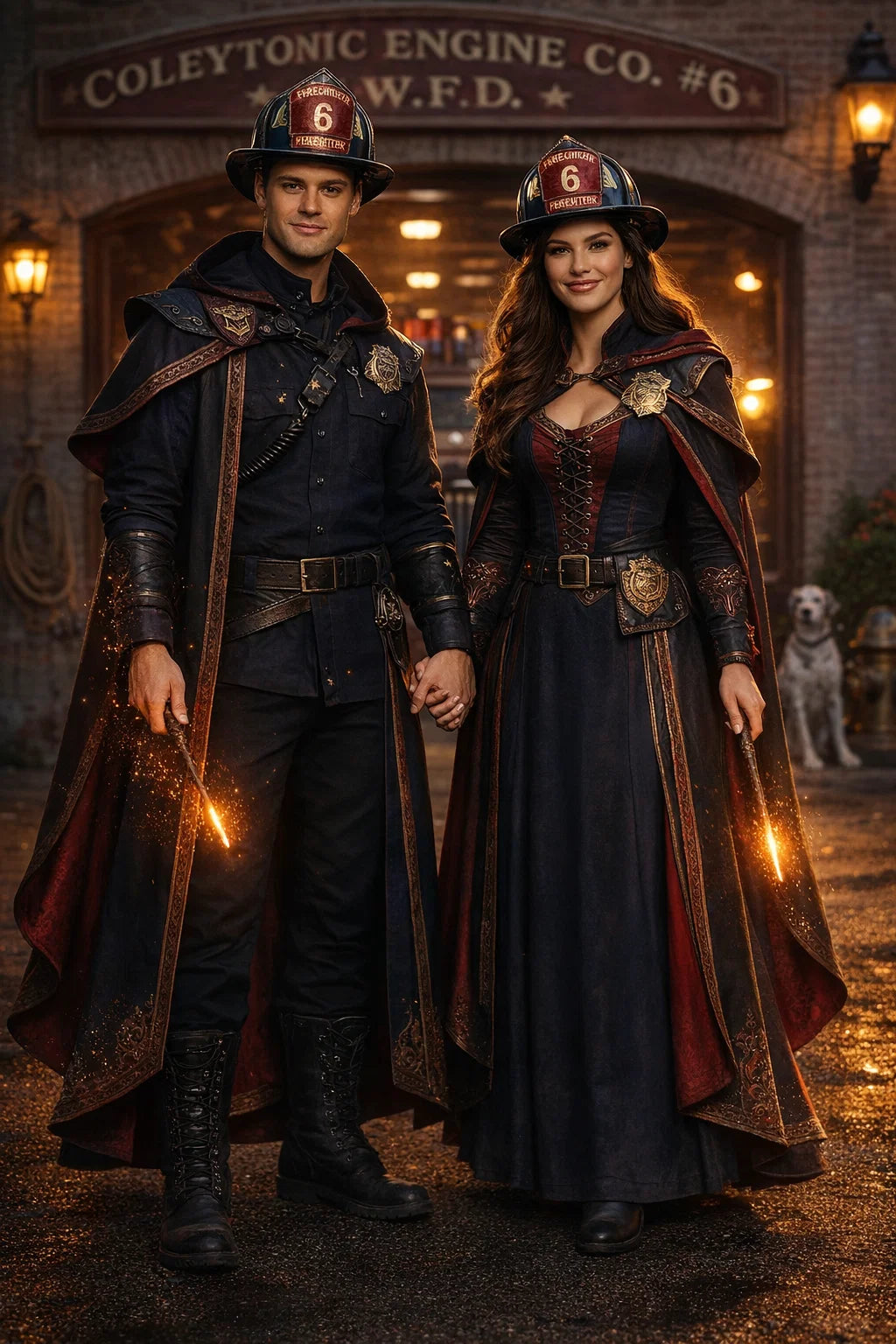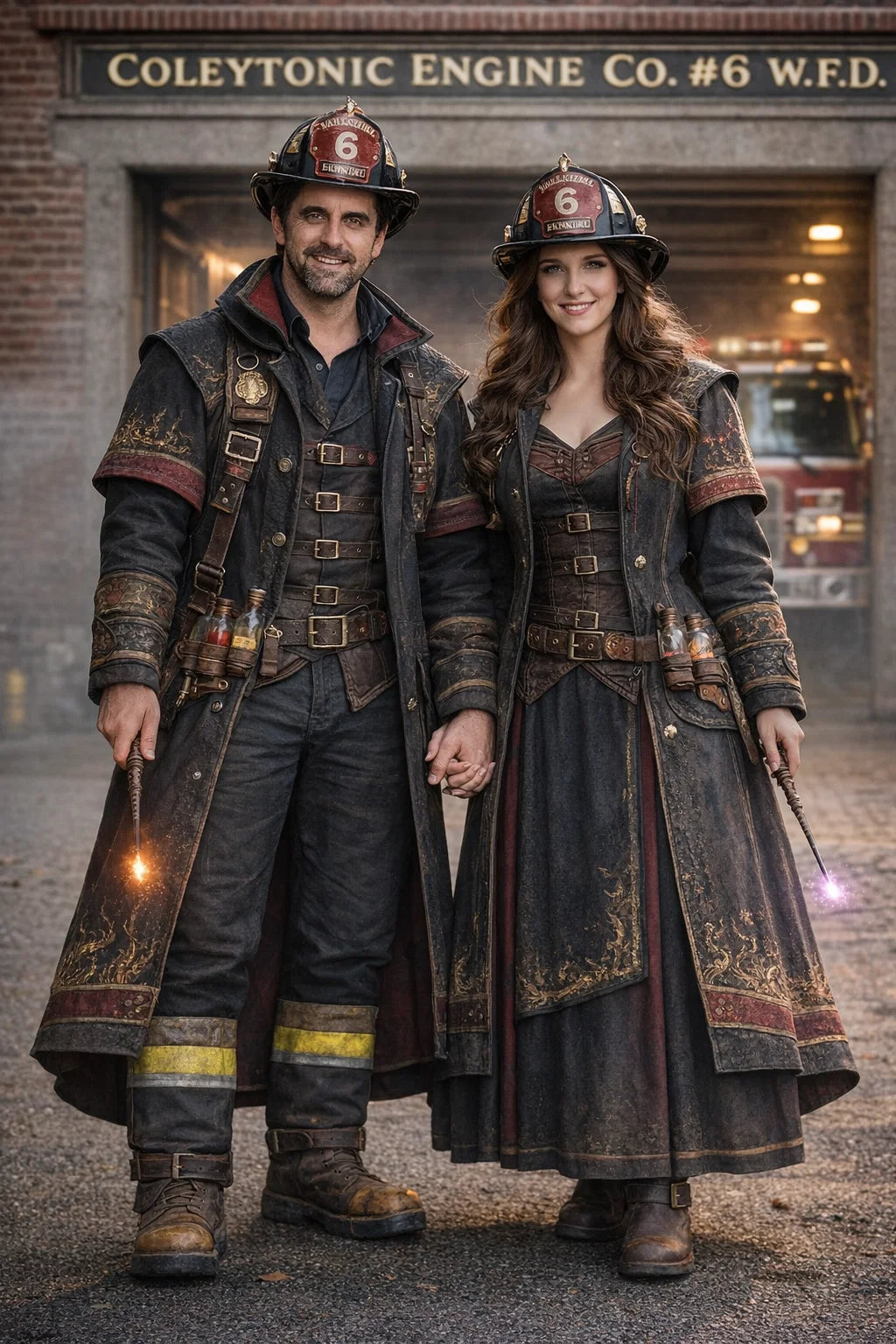 the fireman and firewoman couple #1 of Coleytonic Engine CO. #6 W.F.D. / the 35-year-old good human-witch and good human-wizard couple.