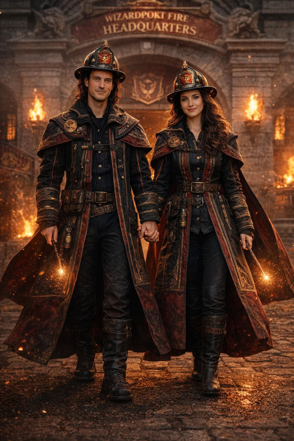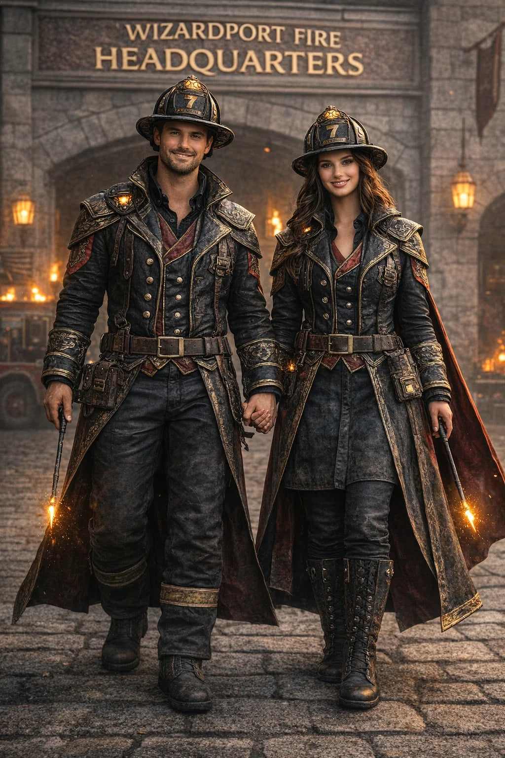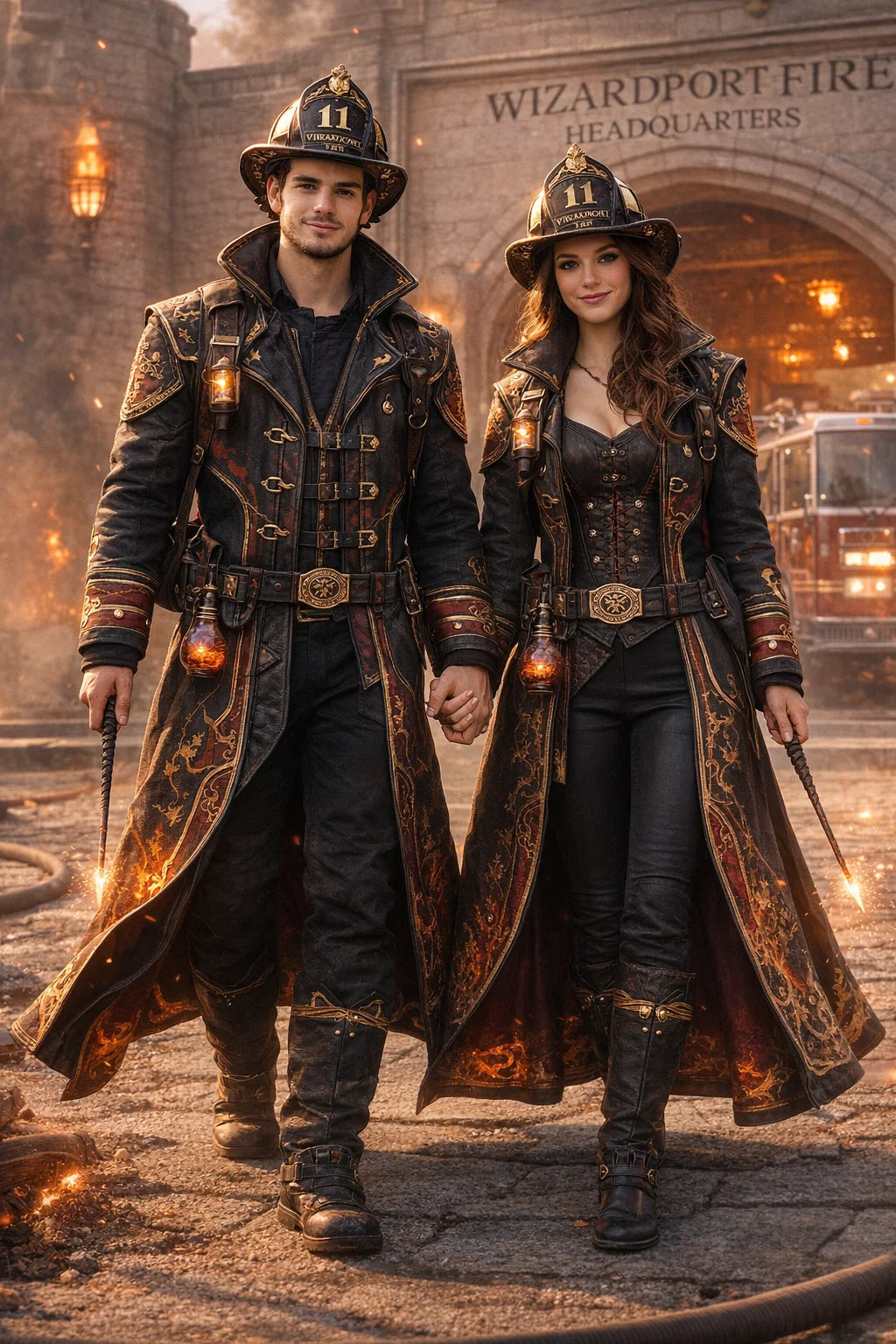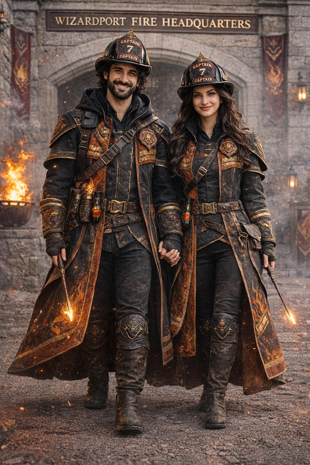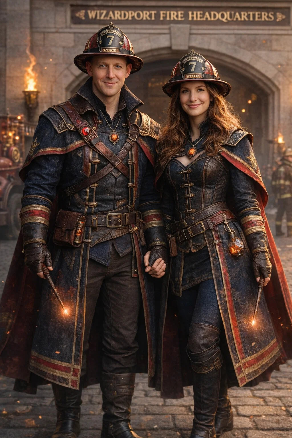 the fireman and firewoman couple #1 of Wizardport Fire Headquarters / the 35-year-old good human-witch and good human-wizard couple.