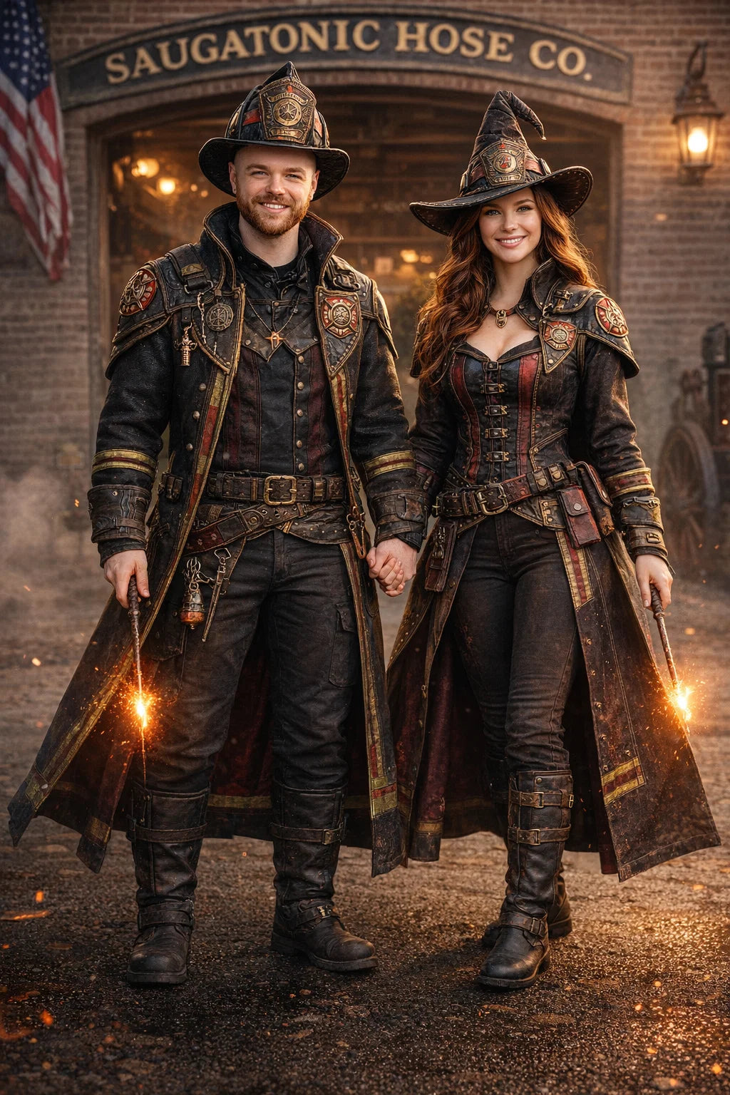 the fireman and firewoman couple #1 of Saugatonic Hose CO. / the 35-year-old good human-witch and good human-wizard couple.