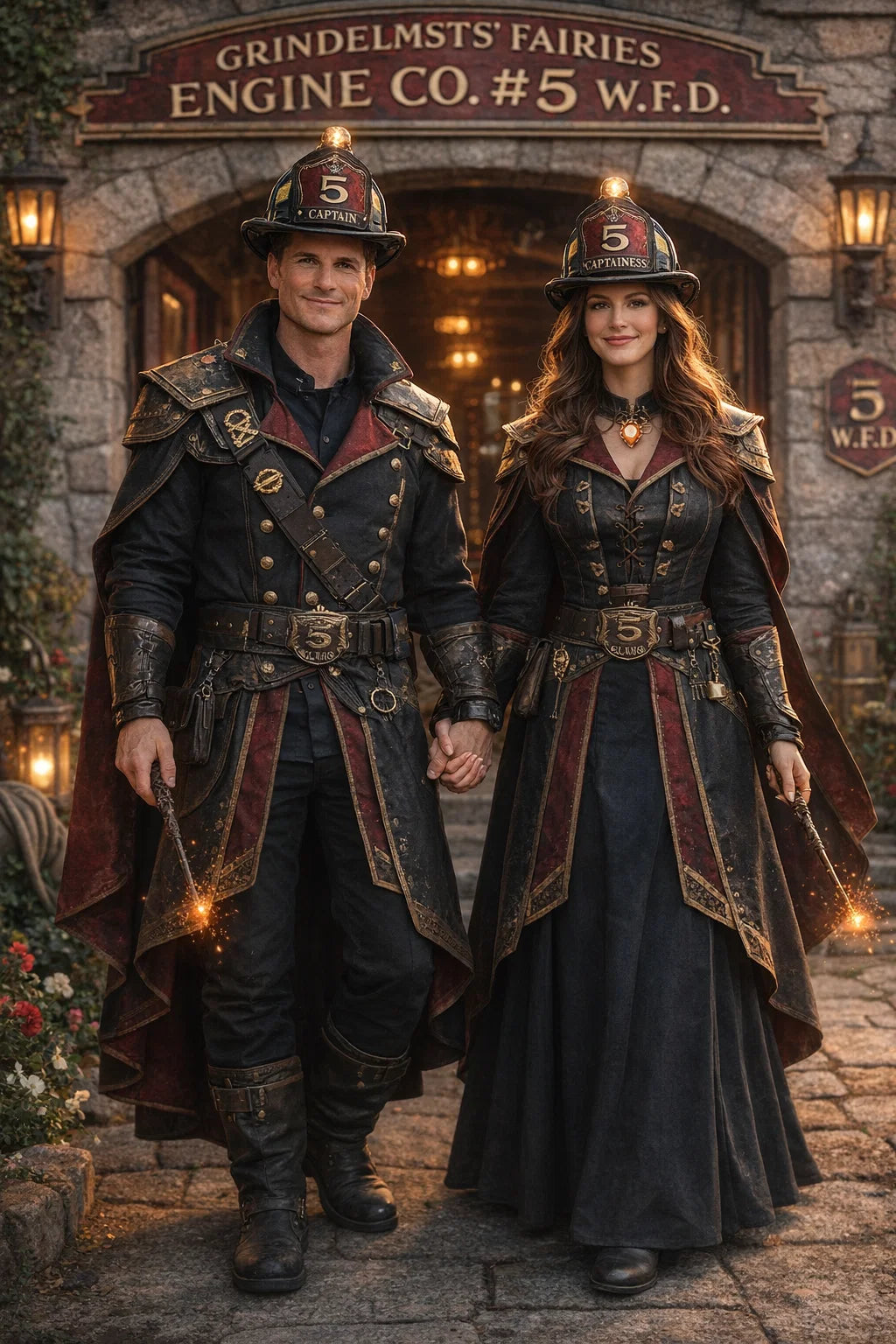 the fire chief and fire chiefess couple of Grindelmist’s Fairies Engine Co. #5 W.F.D. / the 35-year-old good human-witch and good human-wizard couple.